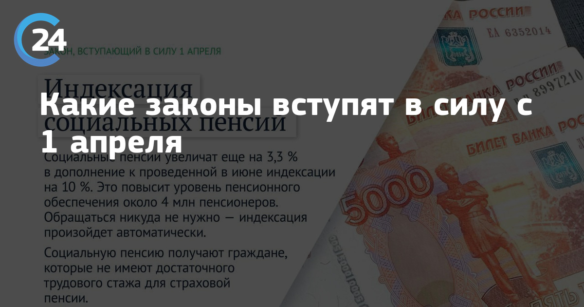 Повышение социальных пенсий, дополнительные меры по защите владельцев материнского капитала при приобретении жилья, изменение требований к приему на госслужбу - эти и другие законы вступят в силу с начала апреля.
