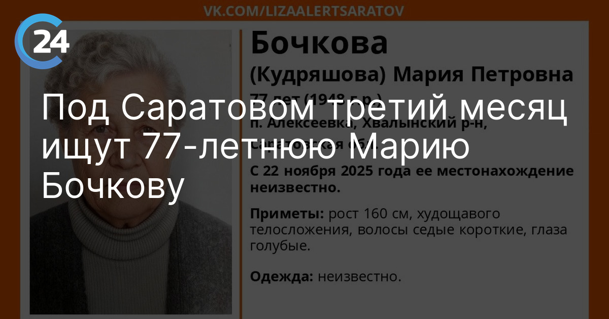 В Саратовской области пропала Мария Бочкова (Кудряшова) из поселка Алексеевский Хвалынского района. 77-летняя женщина ушла из дома 22 ноября 2025 года и не вернулась. Об этом сообщает региональный отряд "ЛизаАлерт" в социальных сетях.