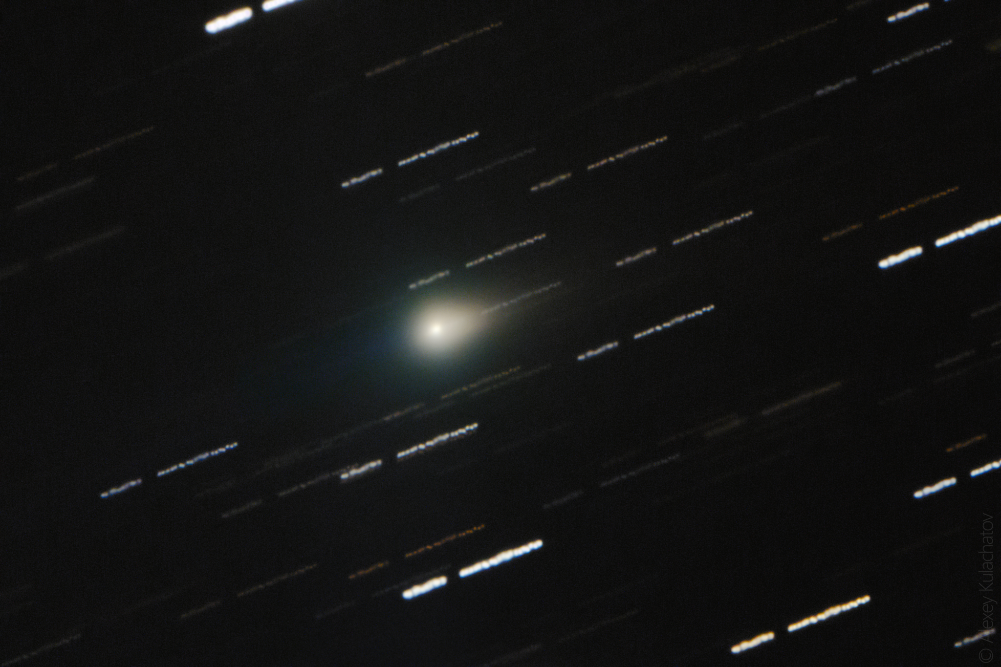 "Хвост на снимке едва различим: вытянутость справа — это на самом деле антихвост, а сам хвост — почти незаметная голубоватая полоска слева", — поясняет саратовский астроном.