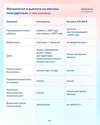 Разобраться в сходствах и отличиях маткапитала и выплаты на ипотеку помогут карточки от портала Госуслуг в галерее.